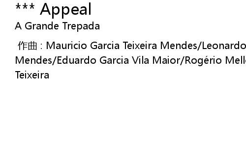 | [00:00.000] | 作曲 : Mauricio Garcia Teixeira Mendes/Leonardo Garcia Teixeira Mendes/Eduardo Garcia Vila Maior/Rogério Mello De Andrade e Nery/Fabio Araujo Teixeira |