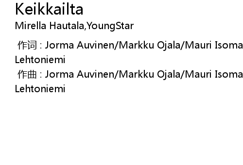 | [00:00.000] | 作词 : Jorma Auvinen/Markku Ojala/Mauri Isomaa/Rolf Berg/Valde Lehtoniemi |