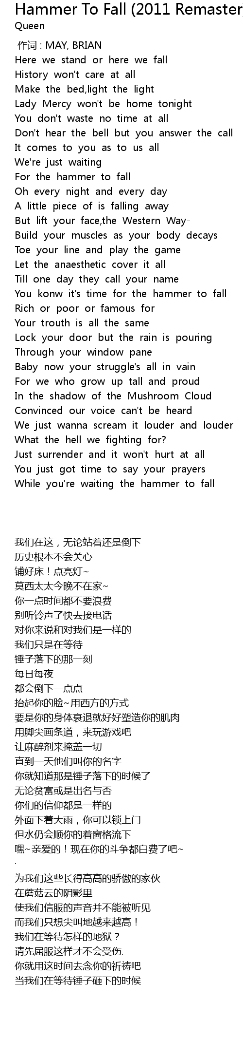 | [00:00.00] | 作词 : MAY, BRIAN |