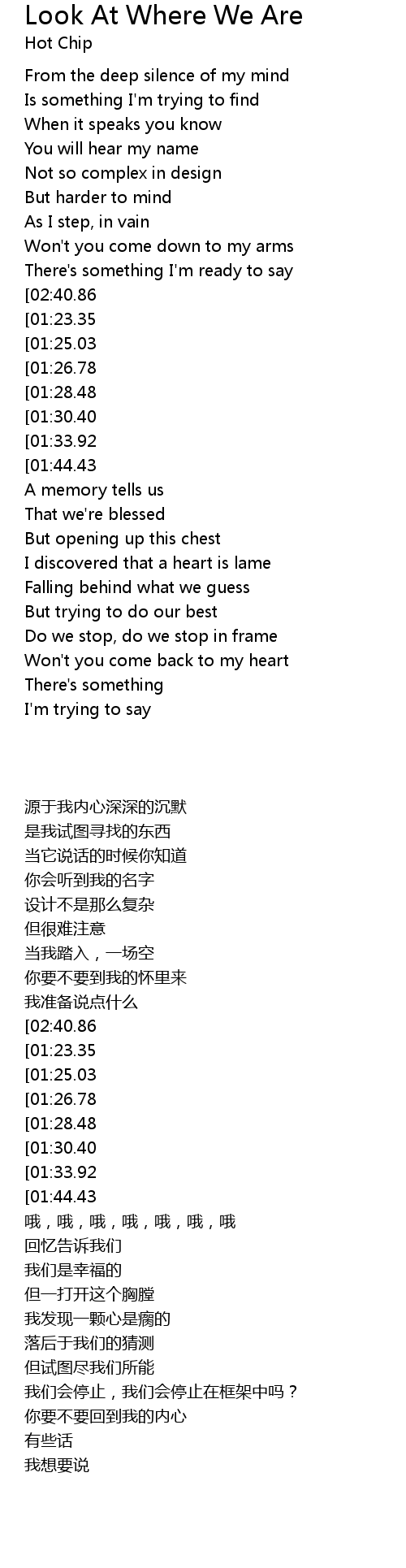 [01:16.53][01:30.40][02:54.54][03:08.54] Look at where we are, are, are