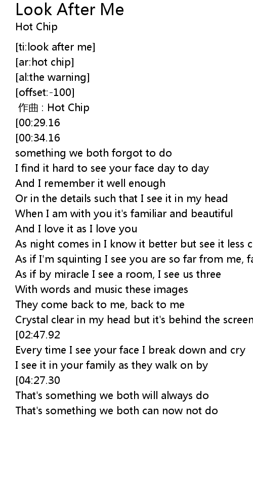 | [00:19.01][00:29.16][01:38.82][01:48.52] | Look after me and I' ll look after you |