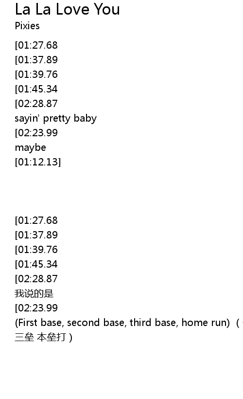 | [02:33.85][02:23.99][02:14.33][02:04.95][01:04.24] | La la love you don't mean maybe |