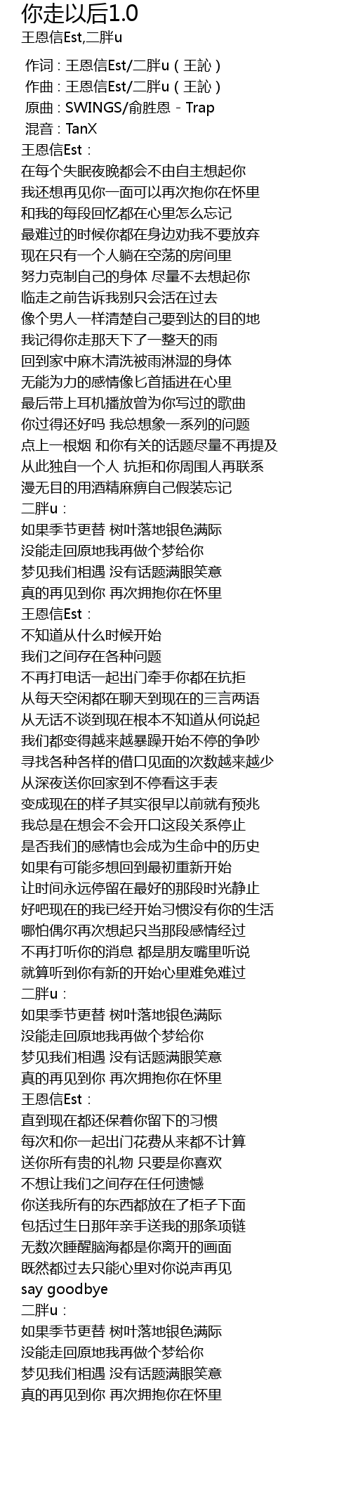 | [00:00.000] | 作词 : 王恩信Est/二胖u(王訫) |