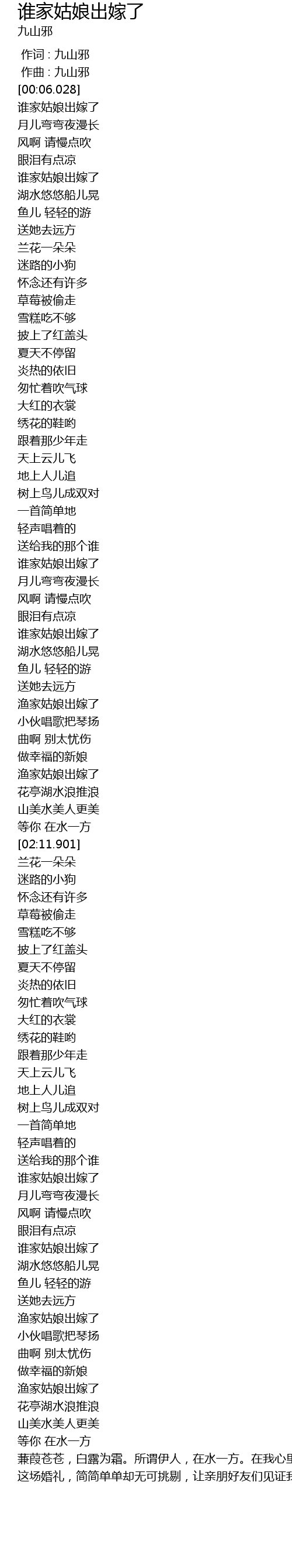 | [00:15.238] | shui jia gu niang chu jia le |