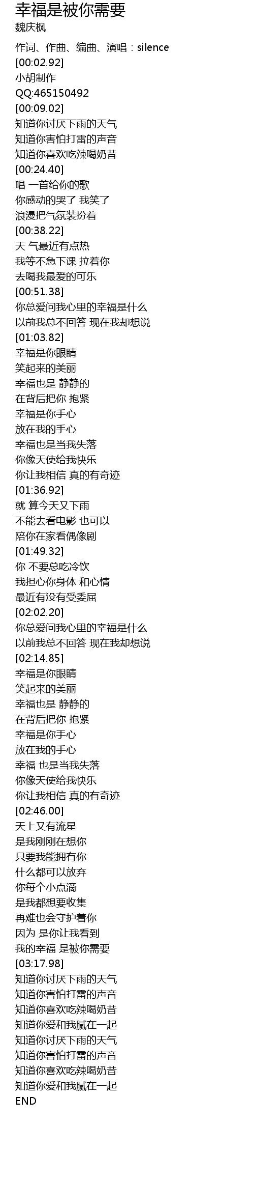 | [03:13.78] | wǒ de xìng fú shì bèi nǐ xū yào |
