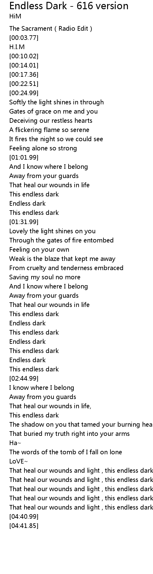 | [04:33.99] | That heal our wounds and light , this endless dark |