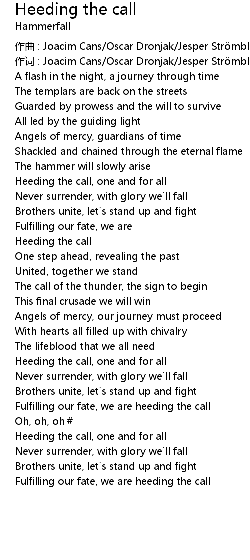 | Fulfilling our fate, we are heeding the call | |