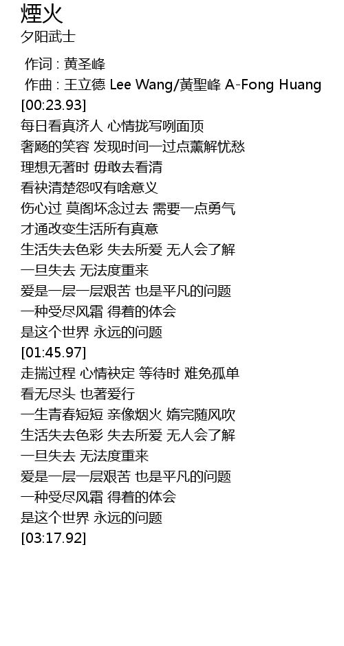 | [00:01.000] | zuò qǔ : wáng lì dé Lee Wang huáng shèng fēng AFong Huang |