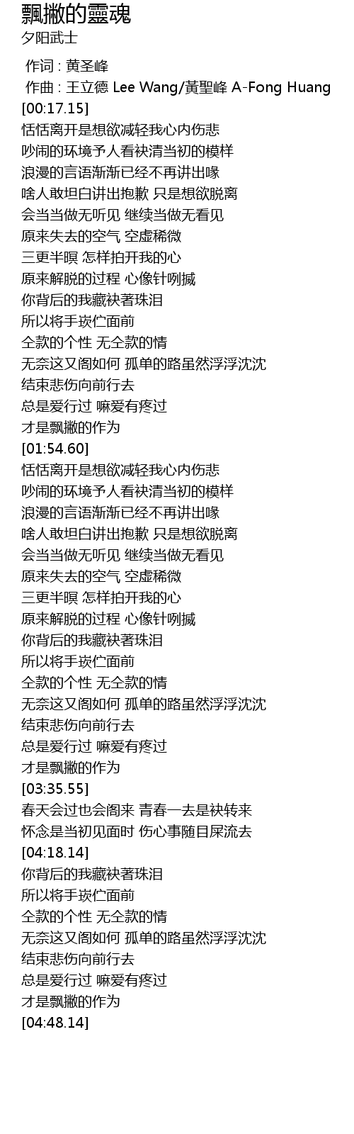| [00:01.000] | zuò qǔ : wáng lì dé Lee Wang huáng shèng fēng AFong Huang |