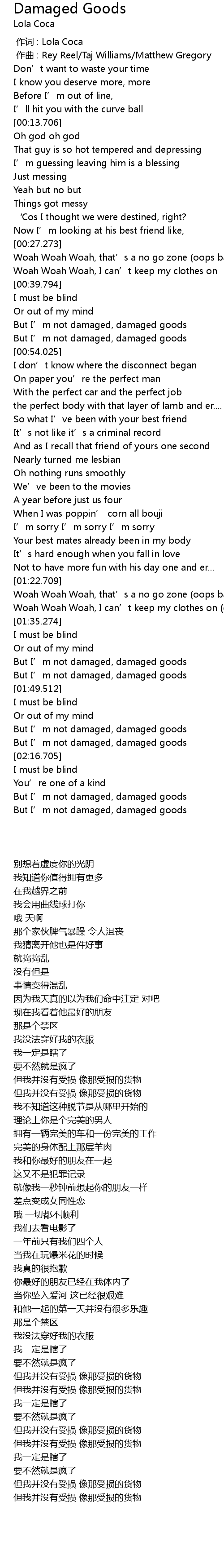 | [02:13.570] | But I' m not damaged, damaged goods |
