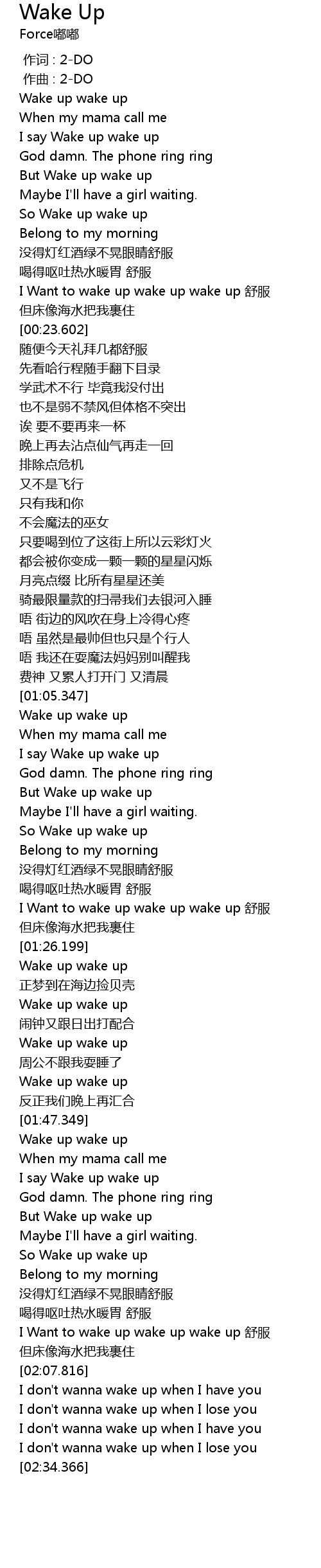 | [02:02.566] | I Want to wake up wake up wake up 舒服 |