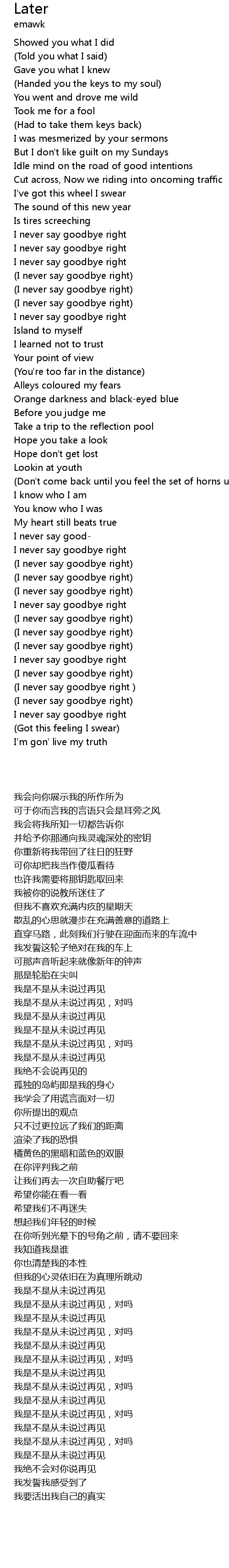 | [00:56.12] | Cut across, Now we riding into oncoming traffic |