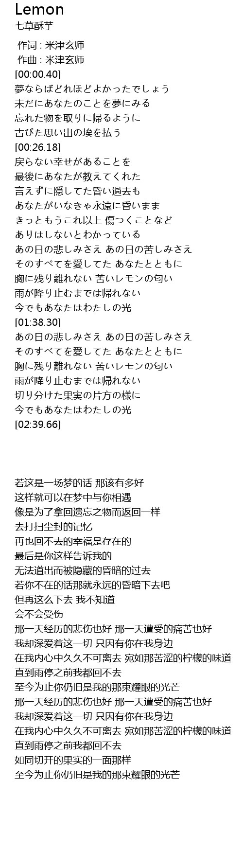 | [02:13.13] | 胸に残り離れない 苦いレモンの匂い |