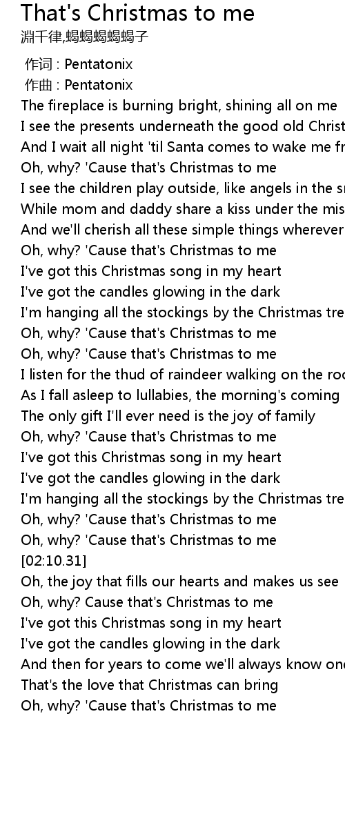 | [02:04.91] | Oh, why? ' Cause that' s Christmas to me |
