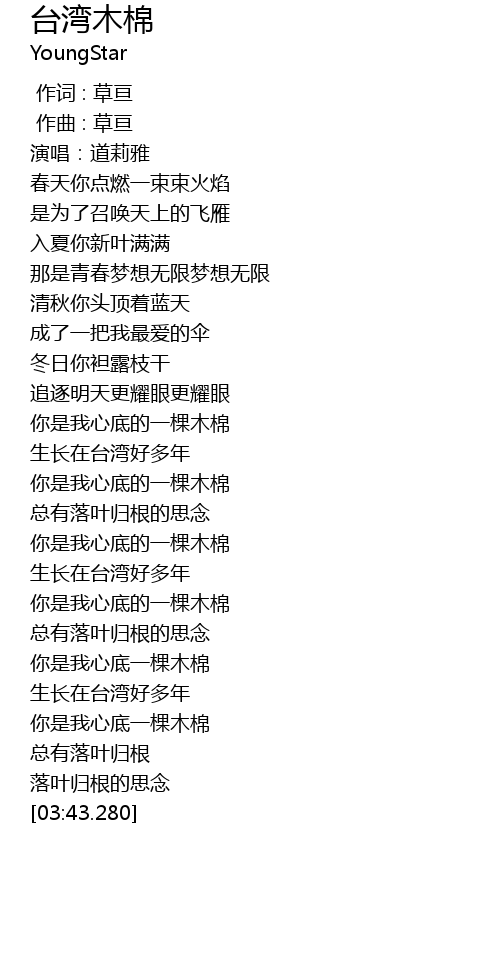 | [03:01.479] | 生长在台湾好多年 |