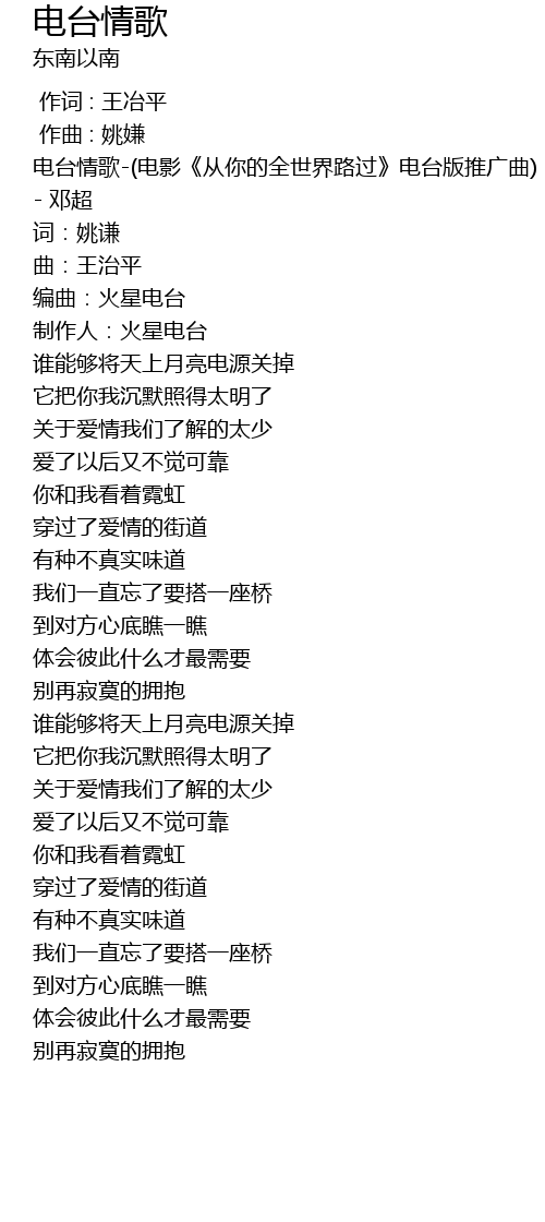 | [00:22.187] | 电台情歌-(电影《从你的全世界路过》电台版推广曲) - 邓超 |