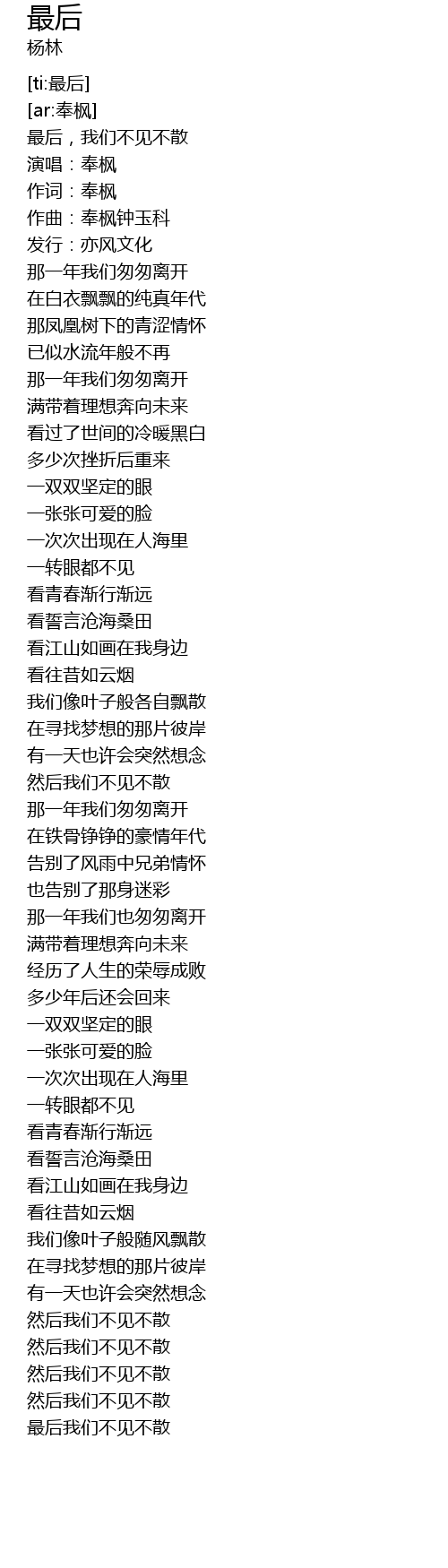 | [00:01.361] | zuì hòu, wǒ men bú jiàn bù sàn |
