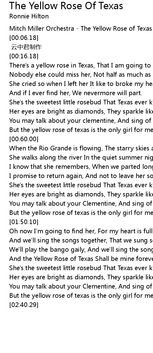 | [00:01.71] | Mitch Miller Orchestra The Yellow Rose of Texas |