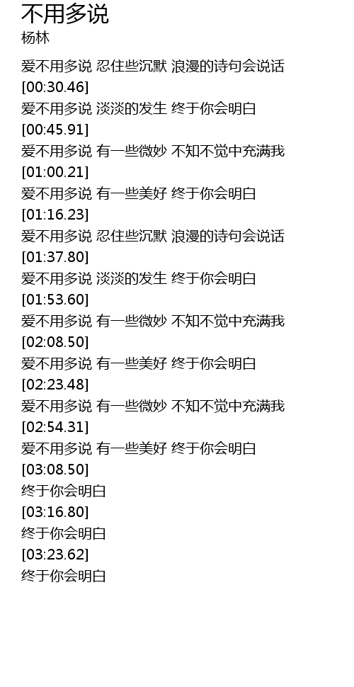 | [01:25.91] | 爱不用多说 忍住些沉默 浪漫的诗句会说话 |