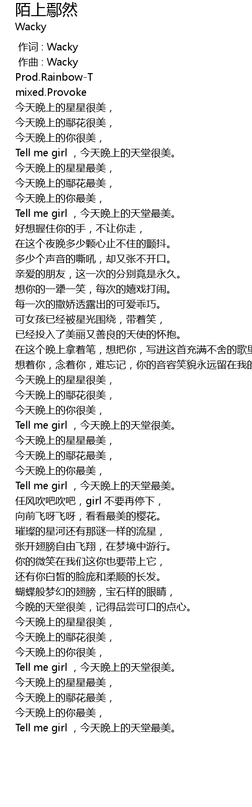 | [02:54.70] | Tell me girl , jīn tiān wǎn shàng de tiān táng zuì měi. |