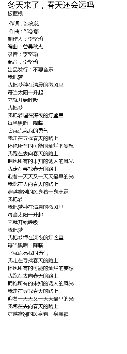 | [03:01.33] | wǒ zǒu zài xún zhǎo chūn tiān de lù shàng |