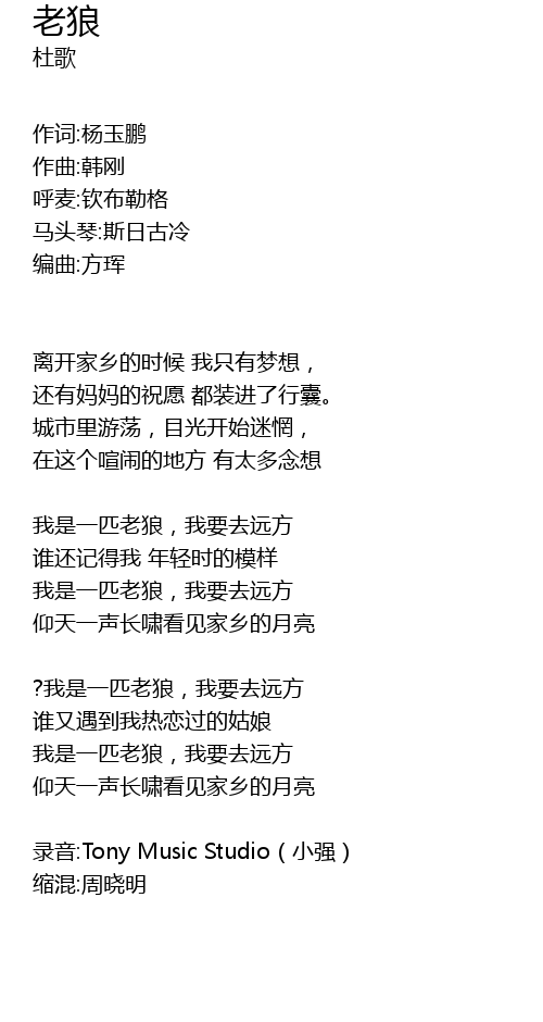 | wǒ shì yī pǐ lǎo láng, wǒ yào qù yuǎn fāng | |
