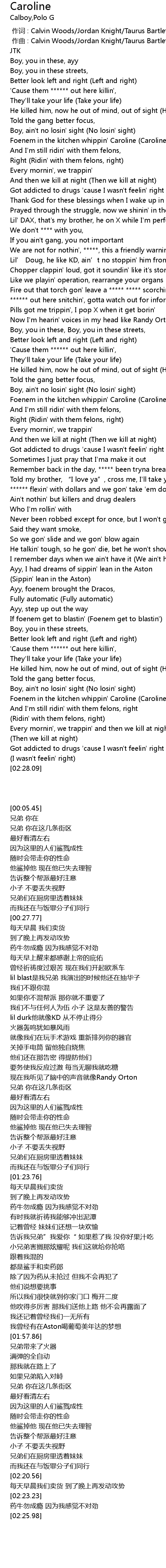 | [00:22.94] | Foenem in the kitchen whippin' Caroline (Caroline) |