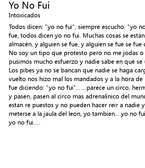 | Todos dicen: " yo no fui", siempre escucho: " yo no fui", y nadie fue, y nadie fue, todos dicen yo no fui. Muchas cosas se esta n vendiendo en este gran almace n, y alguien se fue, y alguien se fue se fue diciendo: " yo no fui". | |