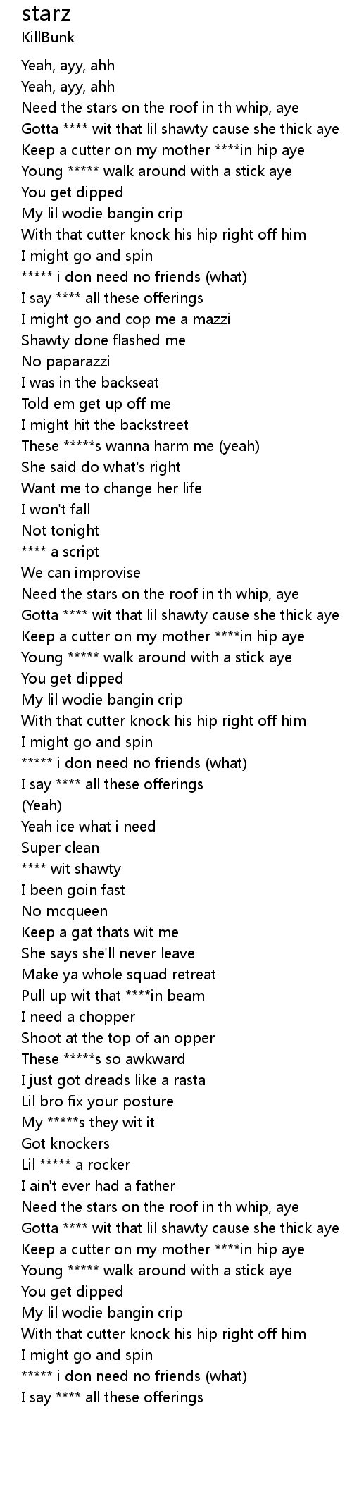 | [02:01.85] | Young ***** walk around with a stick aye |