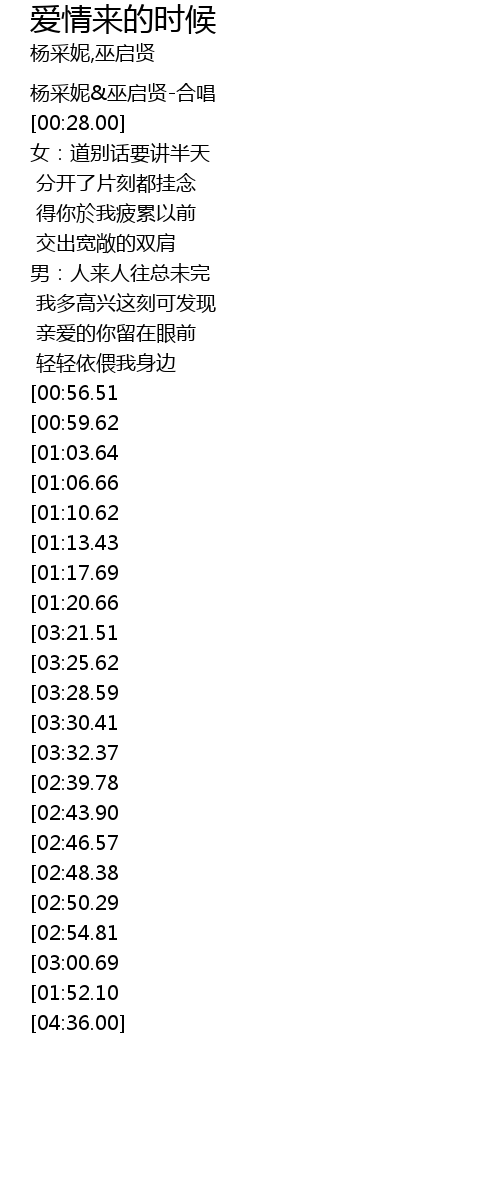 | [00:15.00] | 杨采妮&巫启贤-合唱 |