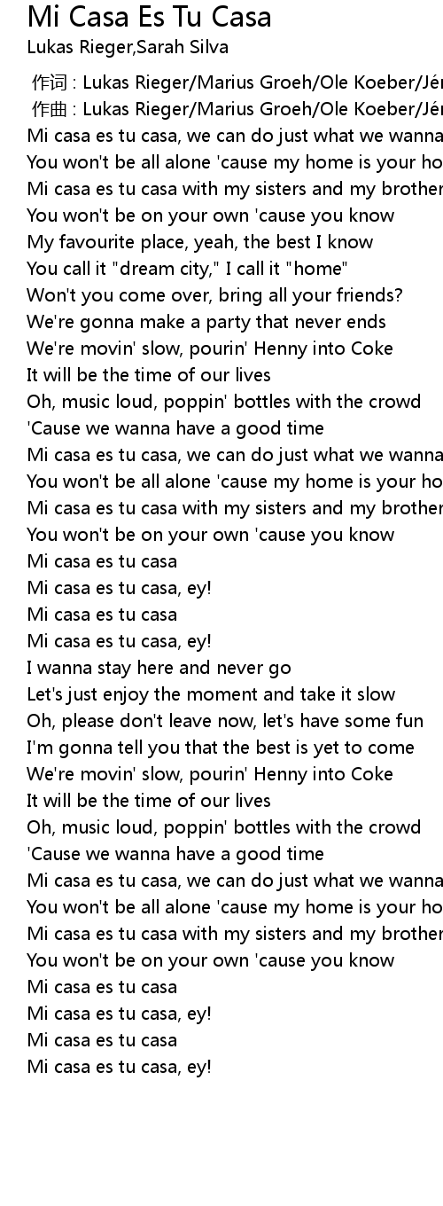 | [00:56.59] | Mi casa es tu casa, we can do just what we wanna |