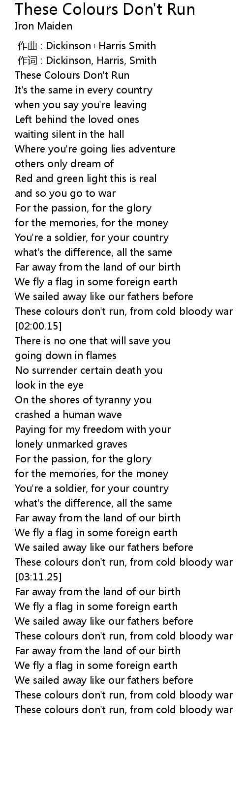 | [01:57.11] | These colours don't run, from cold bloody war |