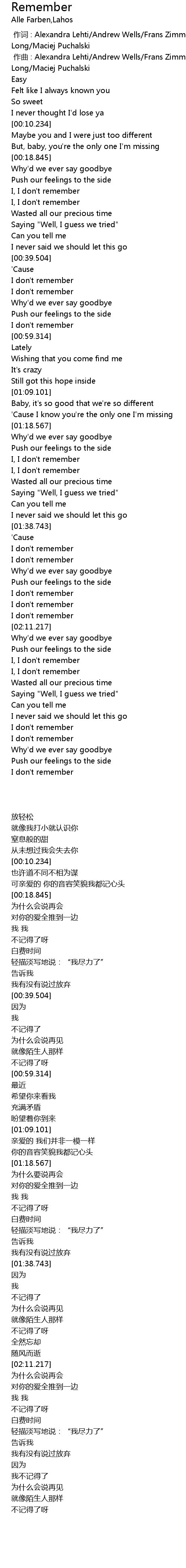 | [00:00.000] | zuò cí : Alexandra Lehti Andrew Wells Frans Zimmer Kevin Zuber Nick Long Maciej Puchalski |