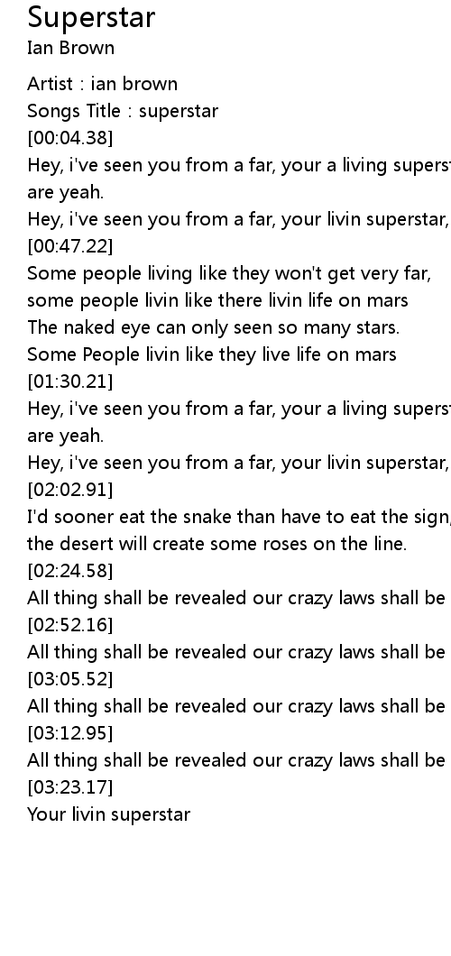 | [00:22.70] | Hey, i've seen you from a far, your a living superstar thats what you are yeah. |