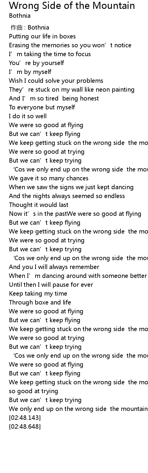 | [02:41.147] | We only end up on the wrong side the mountain |