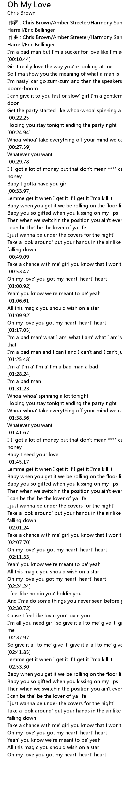 | [00:01.000] | zuo qu : Chris Brown Amber Streeter Harmony Samuels Courtney Harrell Eric Bellinger |