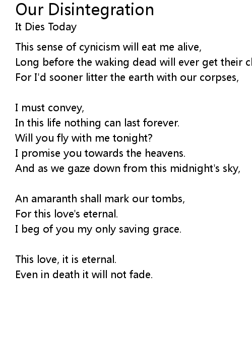 Please take my life tonight, let's disintegrate. [chorus] |