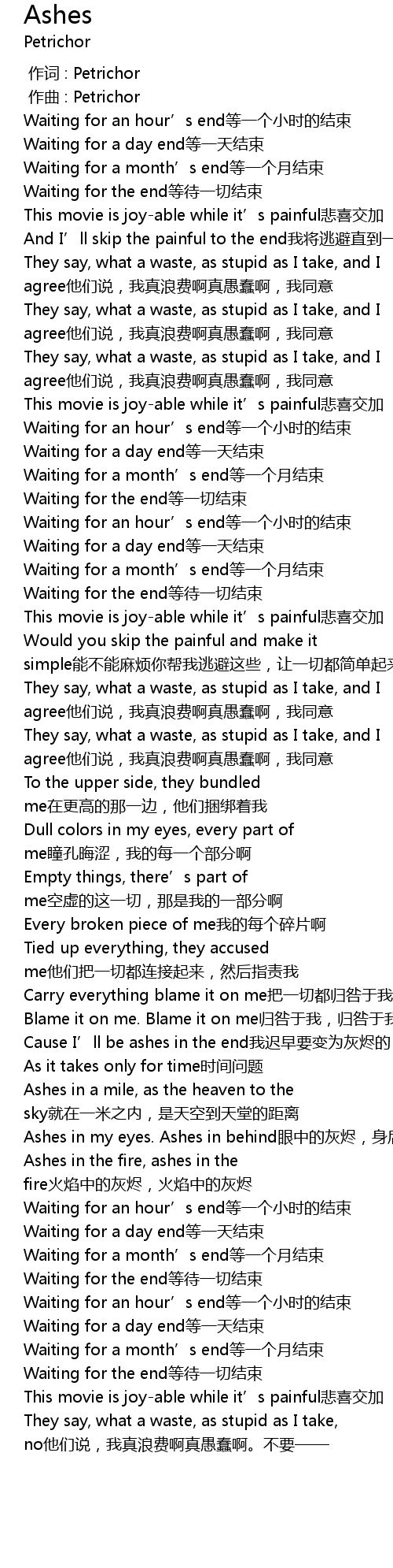 | [02:41.819] | Ashes in my eyes. Ashes in behind yǎn zhōng de huī jìn, shēn hòu de huī jìn |