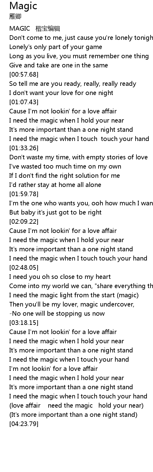 | [01:24.17] | I need the magic when I touch touch your hand |