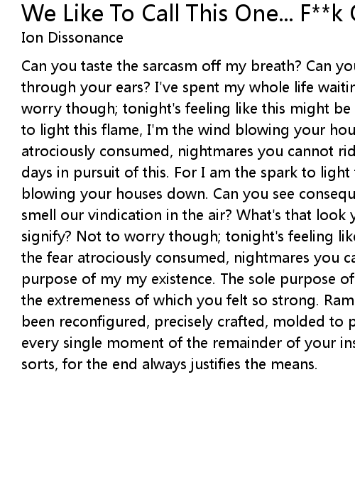 Can you taste the sarcasm off my breath? Can you hear our frustration streaming through your ears? I've spent my whole life waiting for this moment, not to worry though; tonight's feeling like this might be the one. For I am the spark to light this flame, I'm the wind blowing your houses down. I'm the fear atrociously consumed, nightmares you cannot rid yourself of, until the end of days in pursuit of this. For I am the spark to light this flame, I'm the wind blowing your houses down. Can you see consequences to your actions? Can you smell our vindication in the air? What's that look you carry on your face signify? Not to worry though; tonight's feeling like this might be the one. I'm the fear atrociously consumed, nightmares you cannot rid yourself of. The sole purpose of my my existence. The sole purpose of my very existence, defined by the extremeness of which you felt so strong. Ramification shall be paid. I've been reconfigured, precisely crafted, molded to perfection, in order to make every single moment of the remainder of your insignificant life a settlement of sorts, for the end always justifies the means. |