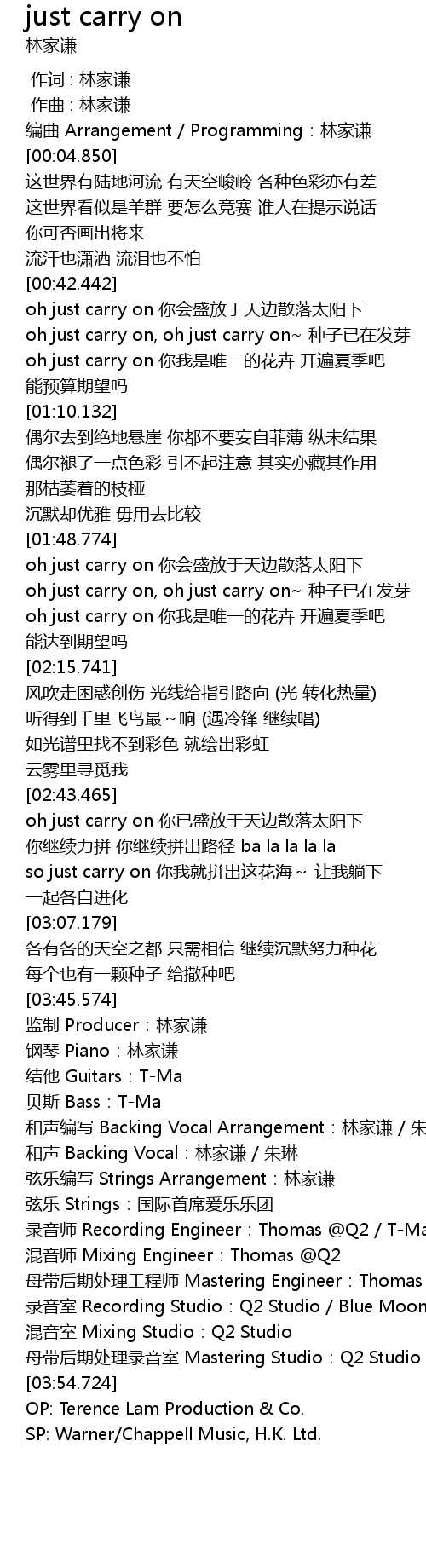 | [00:53.550] | oh just carry on, oh just carry on zhǒng zi yǐ zài fā yá |