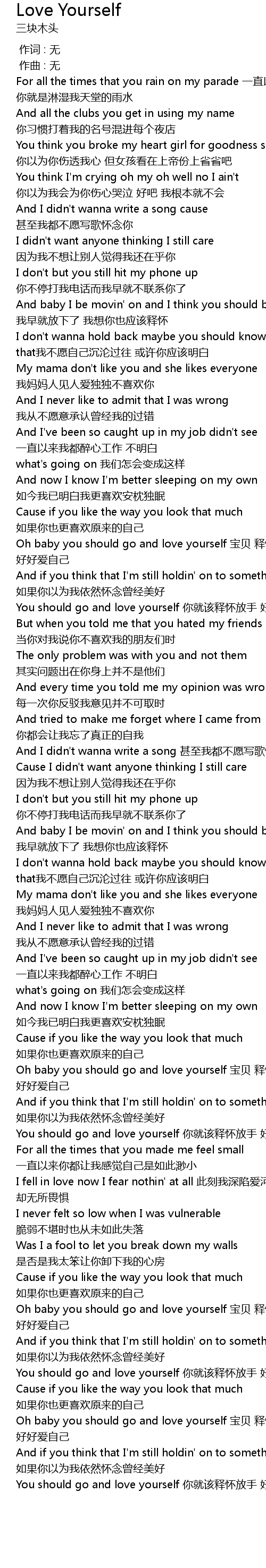 | [03:45.553] | You should go and love yourself ni jiu gai shi huai fang shou hao hao ai zi ji |