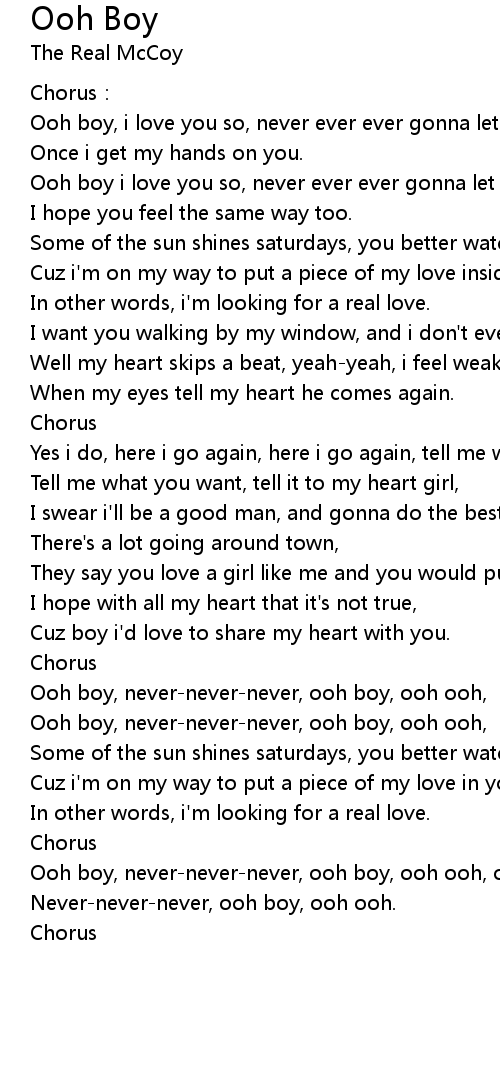 | Ooh boy, never-never-never, ooh boy, ooh ooh, ooh boy, | |