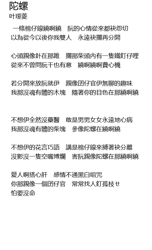 | 沒影沒一隻空嘴博爛 害阮親像陀螺在那繞啊繞 | |