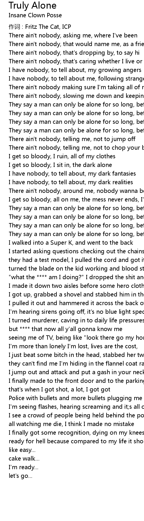 | I get so bloody, all on me, the mess never ends, I' m truly alone | |