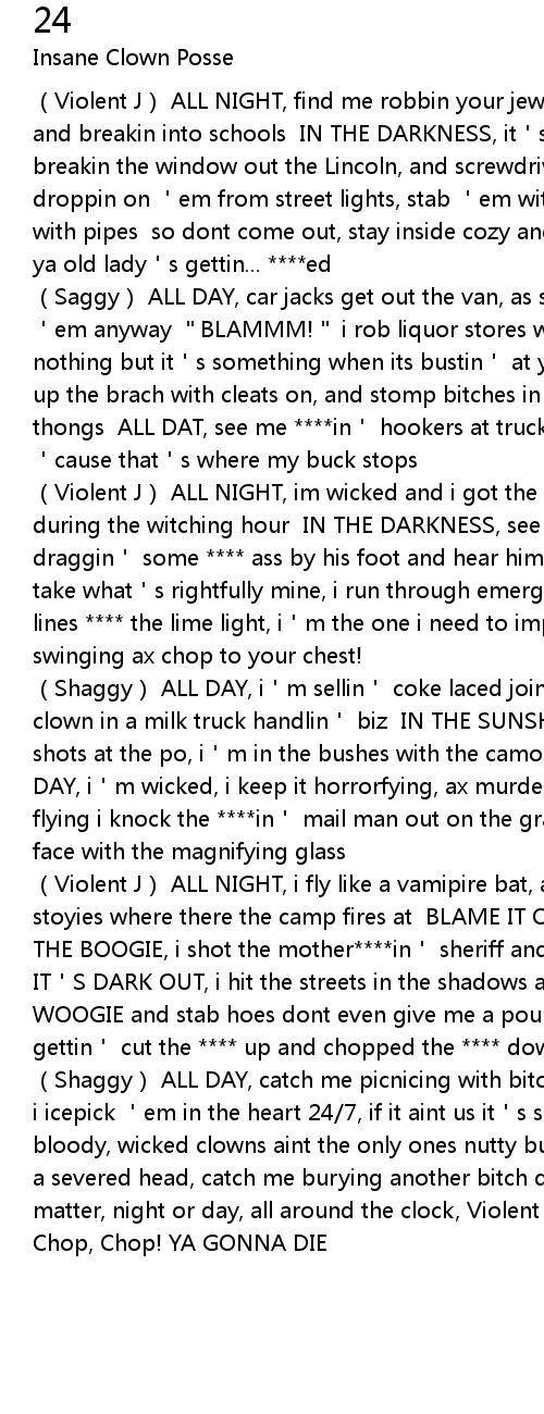 | (Shaggy) ALL DAY, catch me picnicing with bitches in the park, right before i icepick 'em in the heart 24/7, if it aint us it's somebody gettin' bloody, wicked clowns aint the only ones nutty buddy CATCH ME, TOUNGE KISSIN' a severed head, catch me burying another bitch dead behind a shed it doesnt matter, night or day, all around the clock, Violent J and Shaggy Chop, Chop, Chop, Chop! YA GONNA DIE |