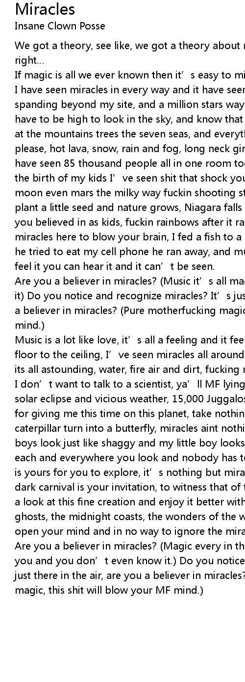 | Music is a lot like love, it' s all a feeling and it feels the room from the floor to the ceiling, I' ve seen miracles all around me, stop and look around its all astounding, water, fire air and dirt, fucking magnets, how do they work? I don' t want to talk to a scientist, ya' ll MF lying and getting me pissed, solar eclipse and vicious weather, 15, 000 Juggalos together and I love my mom for giving me this time on this planet, take nothing for granted, I seen a caterpillar turn into a butterfly, miracles aint nothing to lye, shaggys little boys look just like shaggy and my little boy looks just like daddy, miracles each and everywhere you look and nobody has to stay where they put, this world is yours for you to explore, it' s nothing but miracles beyond your doors, the dark carnival is your invitation, to witness that of there our explanation, take a look at this fine creation and enjoy it better with appreciation, crows ghosts, the midnight coasts, the wonders of the world, mysteries, the most. Just open your mind and in no way to ignore the miracles of everyday, that' s real. | |