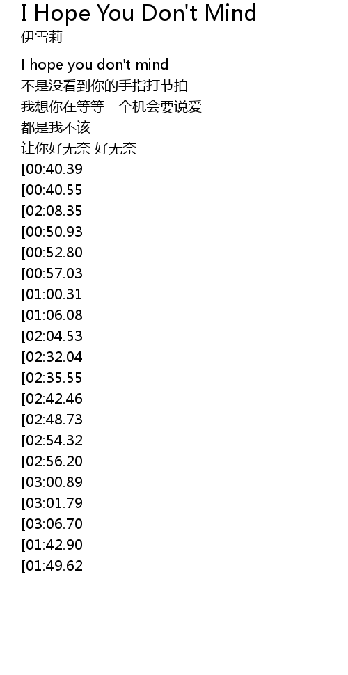 | [04:02.86][03:01.79][01:38.33] | I hope you don't mind |