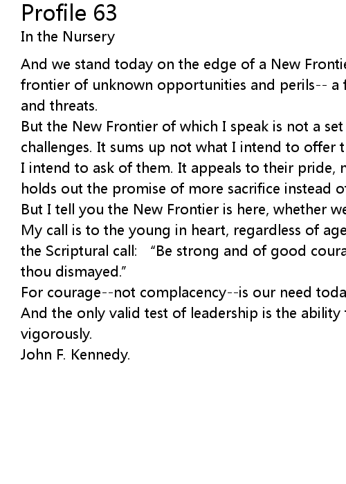 | And we stand today on the edge of a New Frontier the frontier of the 1960' s a frontier of unknown opportunities and perils a frontier of unfulfilled hopes and threats. | |