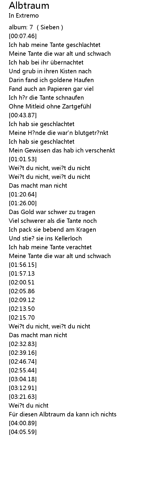 | [00:10.26] | Ich hab meine Tante geschlachtet |